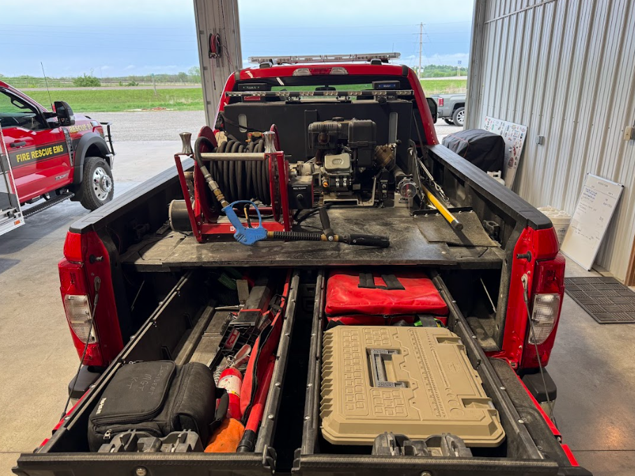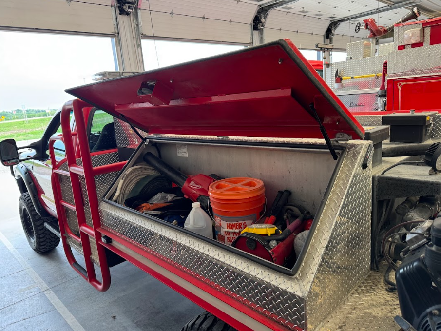 The truck features a bed cap that houses a full-sized skid board and provides enclosed storage for multiple miscellaneous tools, helping ensure equipment is secure, accessible, and mission-ready.