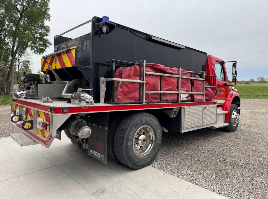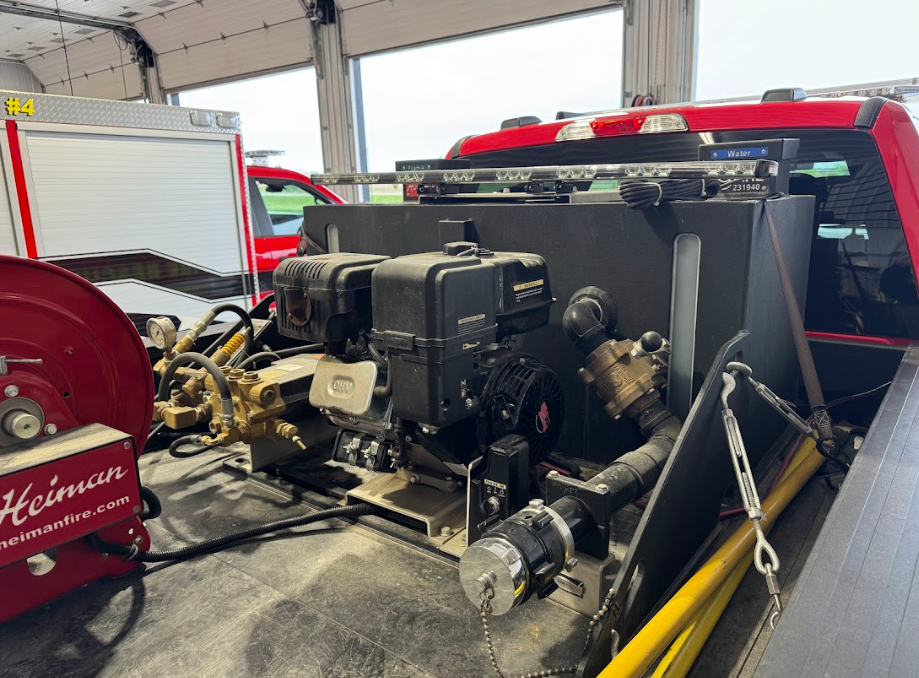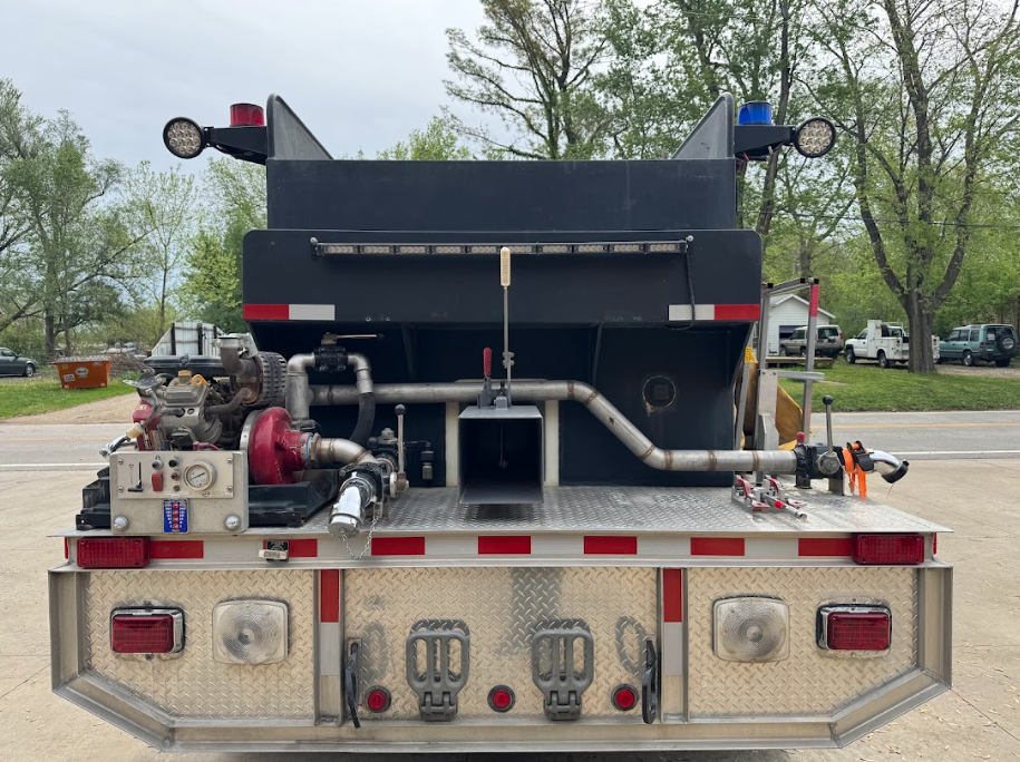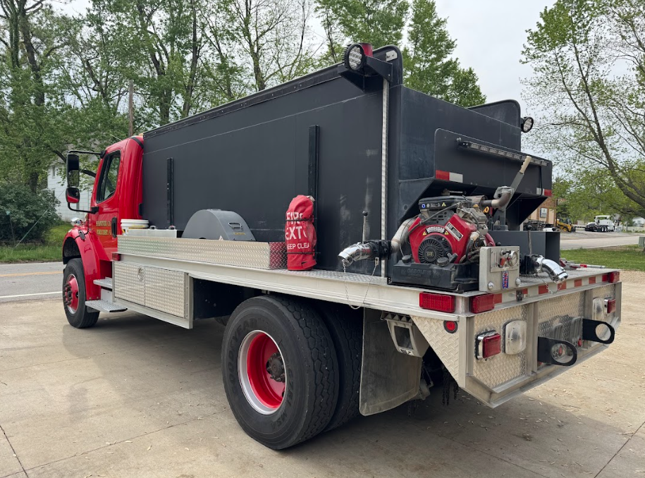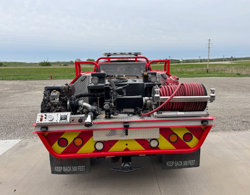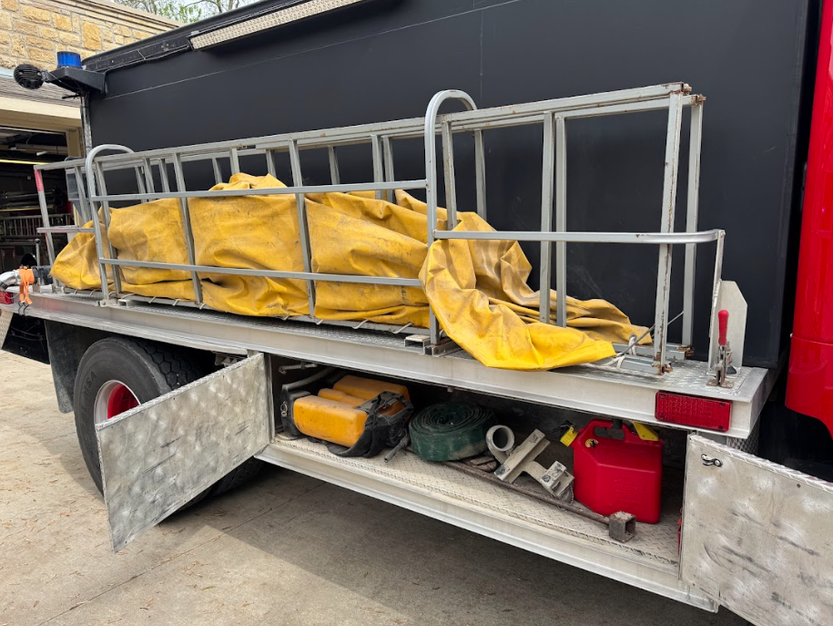 Each unit carries 300 gallons of water and is equipped with a brush transfer pump, providing reliable water flow for wildland fire suppression. Mounted on either side of the trucks are “man baskets,” which allow firefighters to ride safely and apply water while the vehicle is in motion—an essential tool for attacking fires on the move.