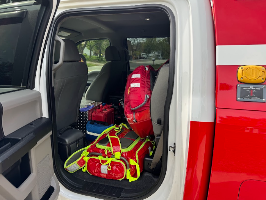 It carries a full complement of advanced medical equipment, including a LifePak 15 cardiac monitor/defibrillator, suction unit, medication bag, folding spine board, and a variety of other essential medical bags. This setup allows crews to deliver high-level pre-hospital care in critical situations.